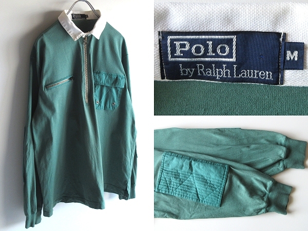 > 希少 90sビンテージ Polo by Ralph Lauren ラルフローレン エルボーパッチ ガチャポケ ハーフジップ プルオーバーシャツ M グリーン 緑