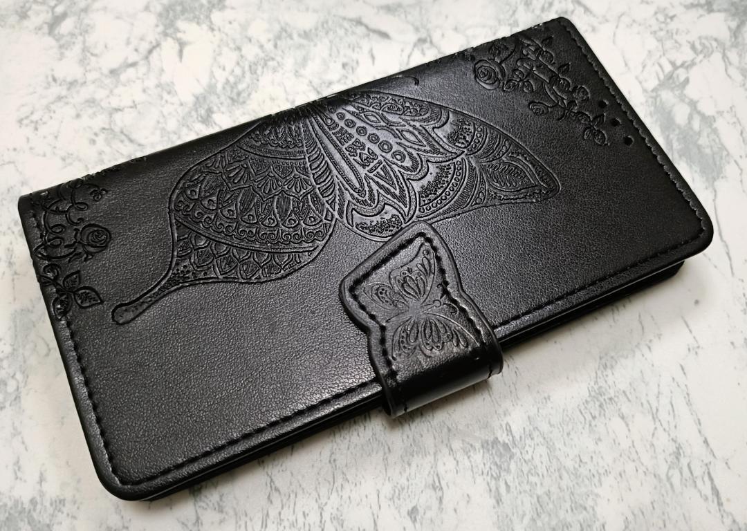> 送料込み iPhone15 用 スマホケース 手帳型 蝶 花柄 ブラック 黒色