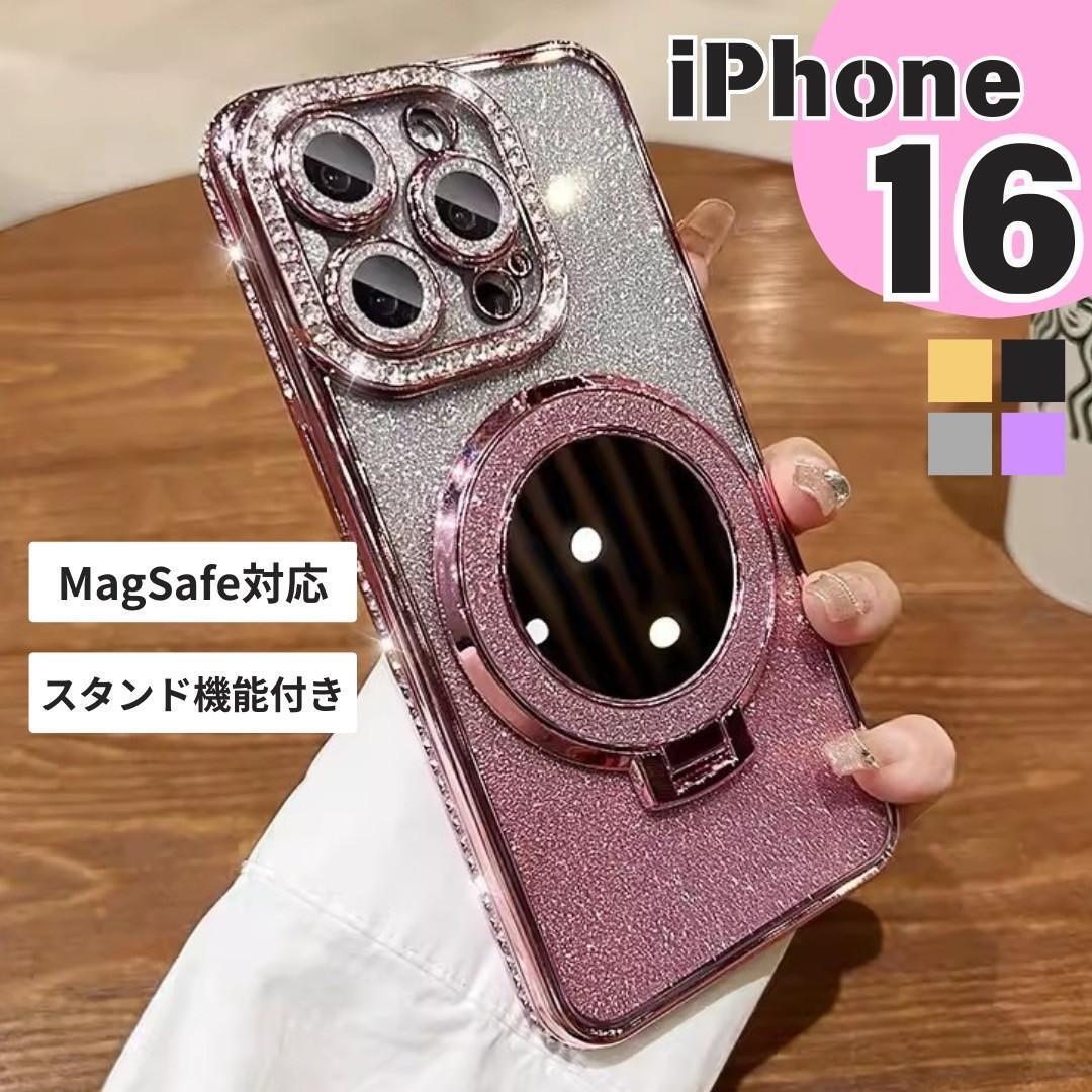 - iPhone16 ケース ミラー付 スタンド付 キラキラ レンズ保護 ピンク