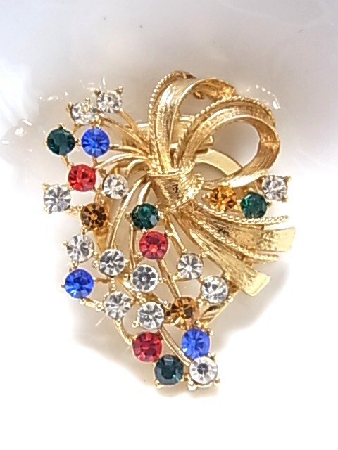- ■ビンテージ/ヴィンテージ マルチカラーのラインストーンが輝いて豪華感 ゴージャスな印象 キラキラ系 レトロの素敵なスカーフ留め
