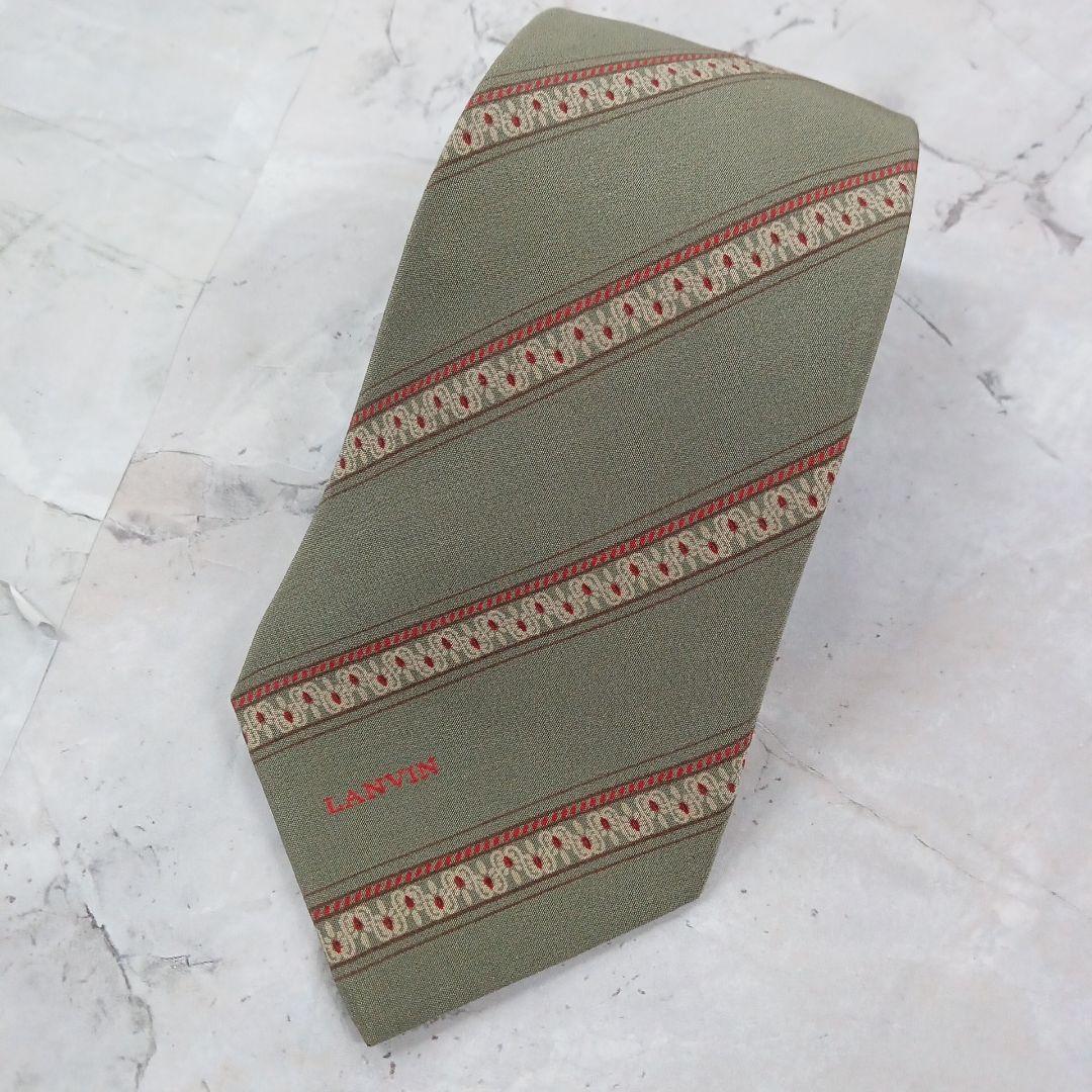 - ランバン パリ ネクタイ 薄緑 赤 薄茶色 ストライプ柄 シルク【n973】