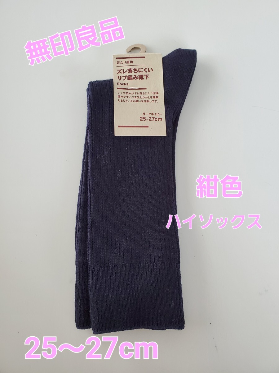 - 無印良品 靴下 ハイソックス 足なり直角 ズレ落ちにくい リブ編み ソックス ダークネイビー 濃紺 25 26 27 スクールソックス 無地
