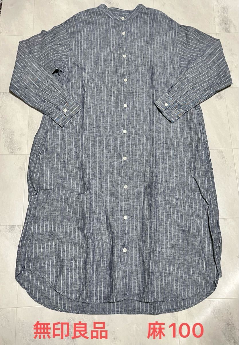 - 無印良品 MUJI リネン 麻100% ストライプ柄 バンドカーラー シャツワンピース ワンピース ロング丈 Mサイズ