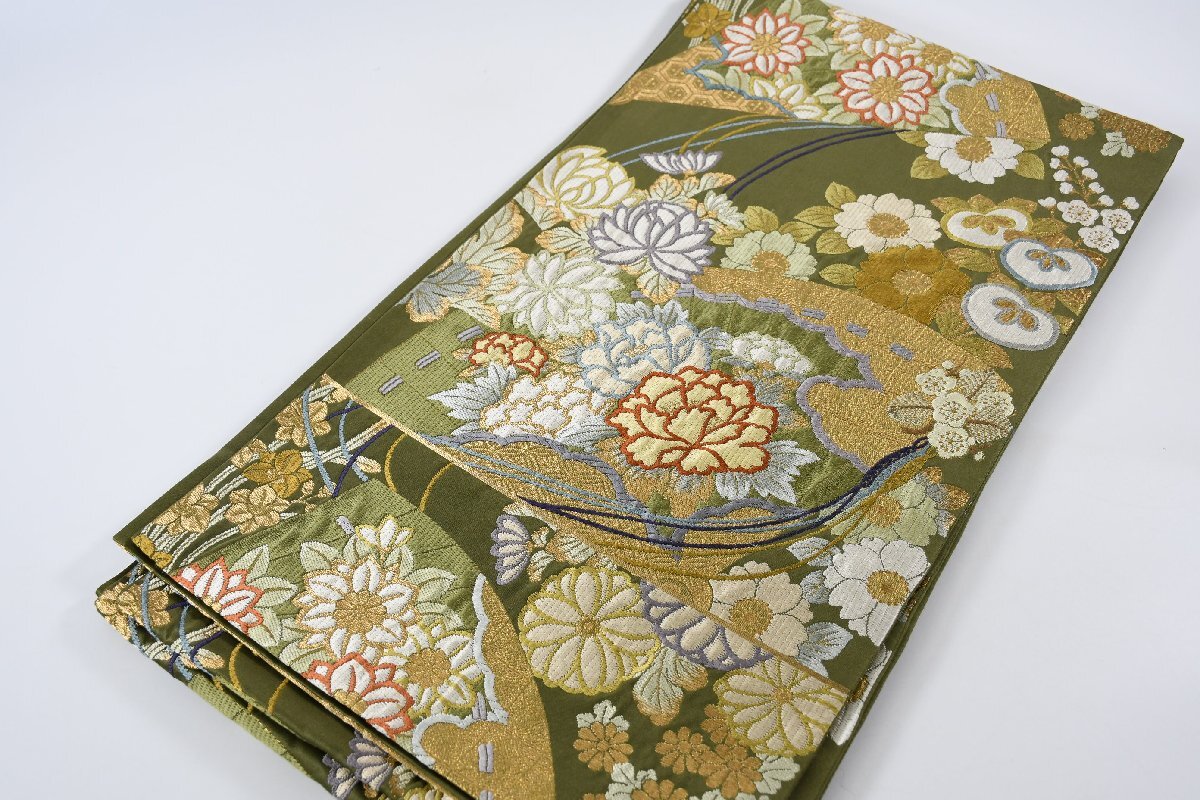 - 袋帯 六通柄 四季扇面文 牡丹 花 帯丈446cm ★着物屋 ne-14709 桜庭呉服店