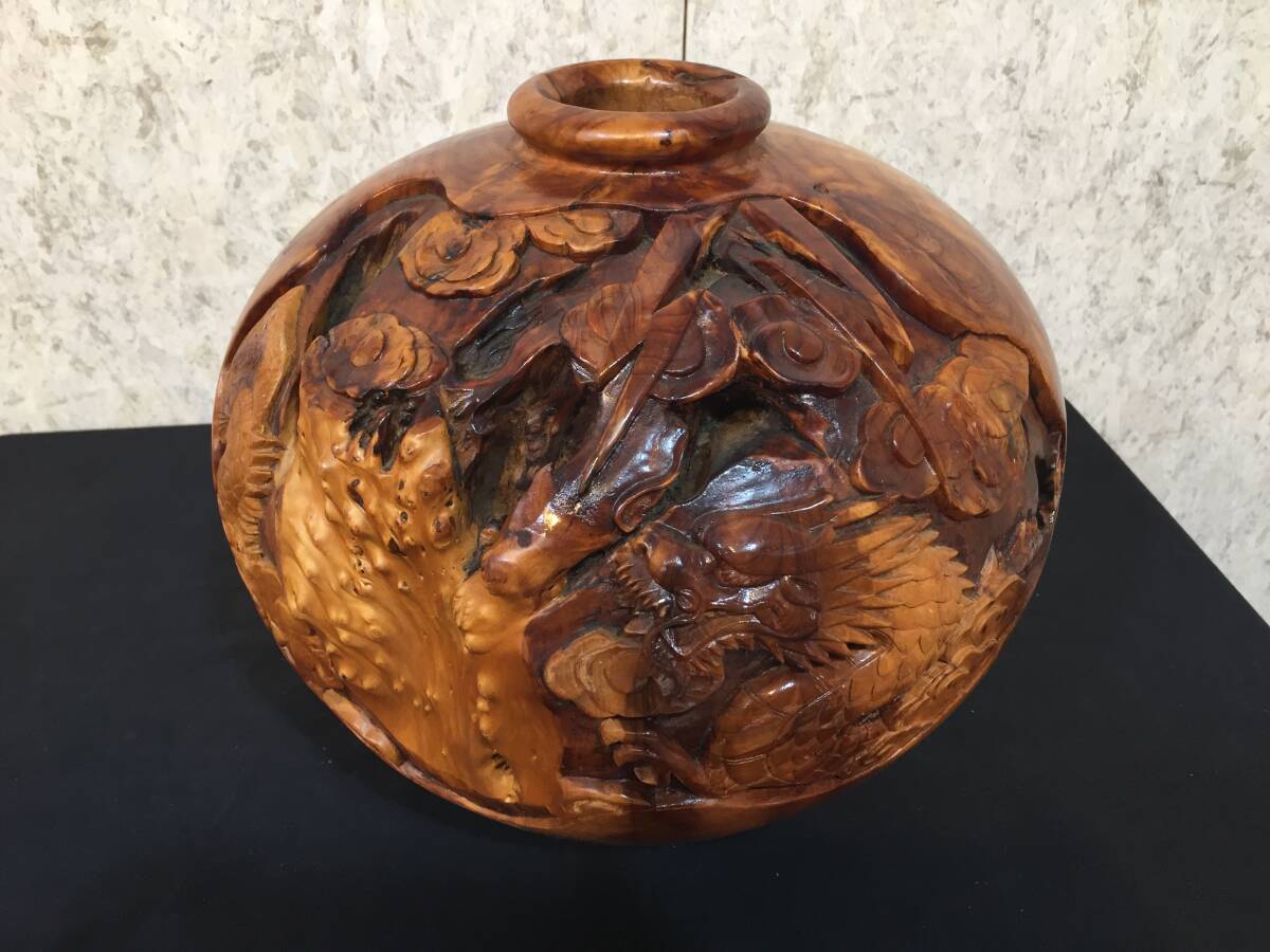 - 『 木製花器 』B2 鑑賞用花器 ケヤキ 欅 玉杢 珍品 高級 龍彫刻 花器 花瓶 造花挿し ディスプレイ アンティーク ★古時家★