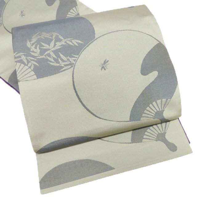 - 袋帯 中古 リサイクル 正絹 カジュアル 仕立て上がり 六通 うちわに笹と虫模様 柳染色 鼠色 きもの北條 A1166-11