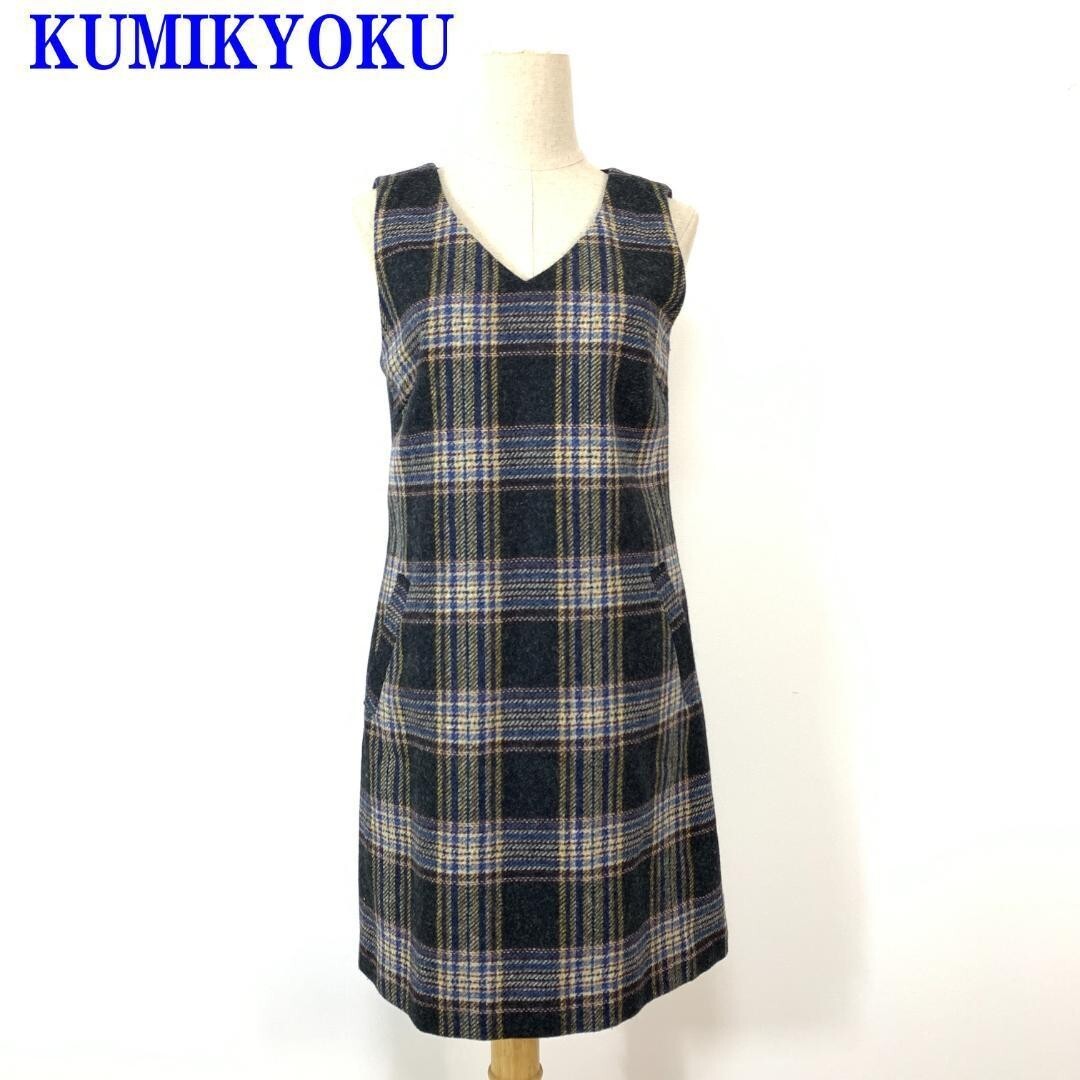 - 組曲 ノースリーブワンピース グレー ネイビー KUMIKYOKU クミキョク チェック ジャンパースカートウール100% 2 C2439