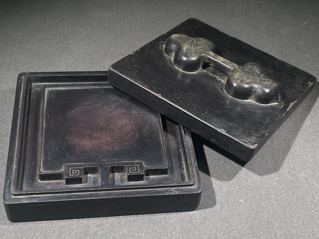 - 【瓏】端石彫 如意石渠文房端渓蓋硯 呉信中銘 清時代 手彫り 文房四寶 書道具 古硯 端硯 古美術 蔵出