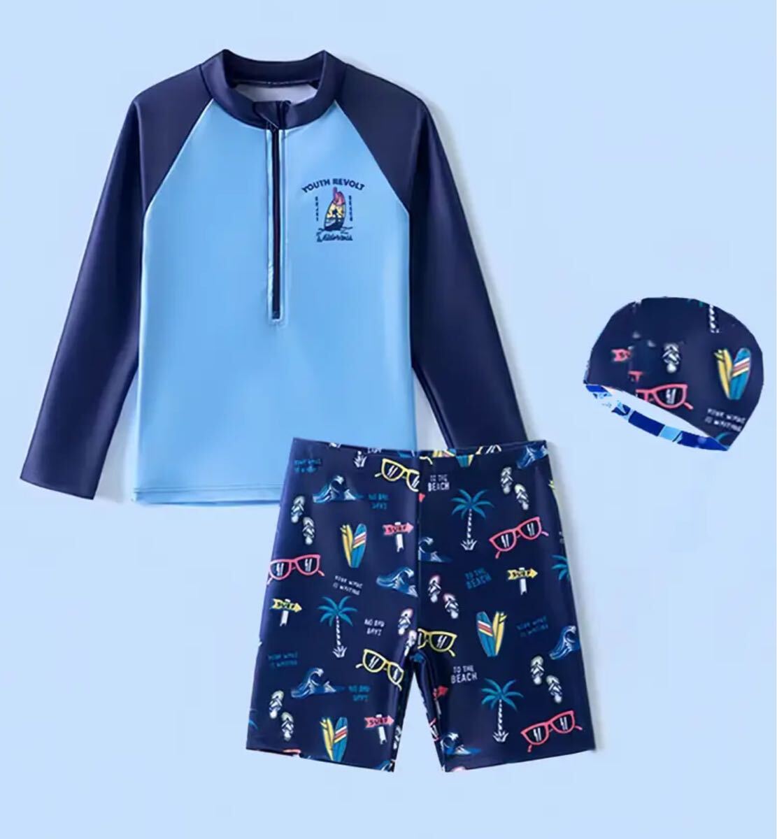 - 新品未使用 男の子 水着 3点セット 長袖 ラッシュガード 帽子 90〜140サイズ
