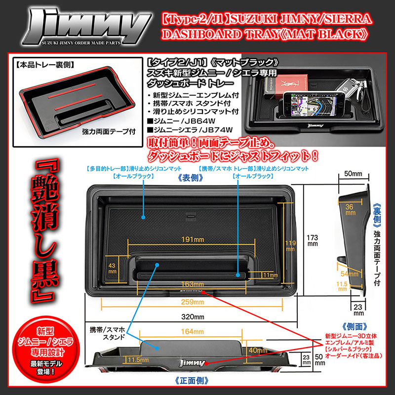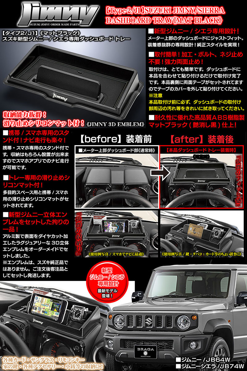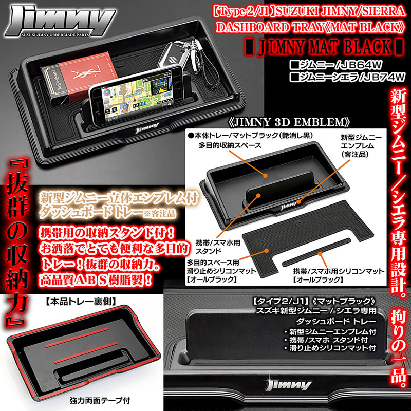 > ジムニーエンブレム付【タイプ2/J1】スズキJB64W新型ジムニー用ダッシュボード トレー[マットブラック/滑り止めマット付]ABS製/ブラガ
