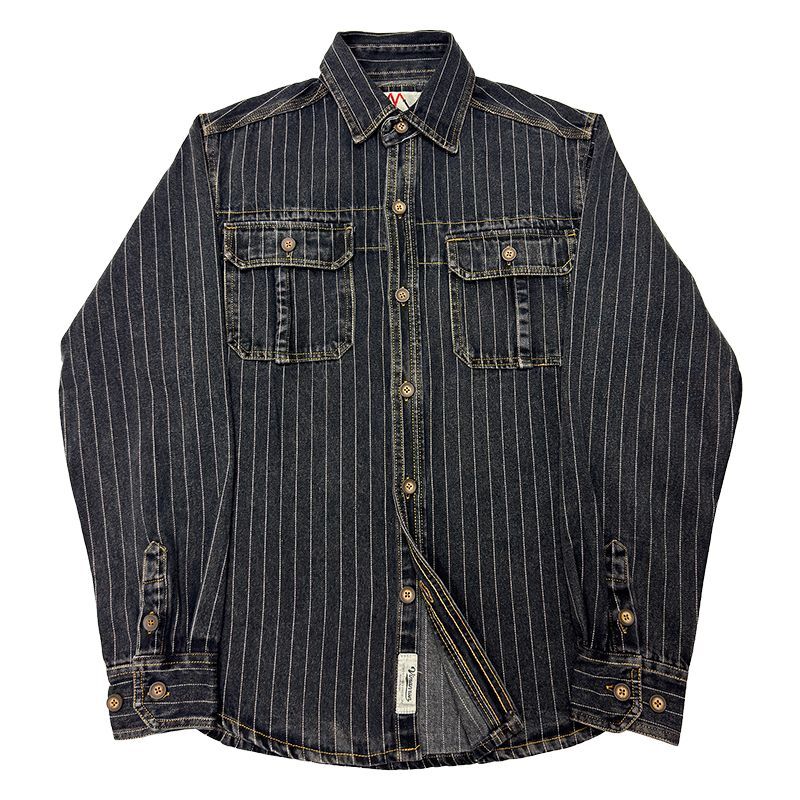 - 新入荷/【アメカジ デニムシャツ】ヘビーオンス ストライプ ワークシャツ メンズ 長袖 ヴィンテージ加工 多ポケット 春 秋 対応/ブラック