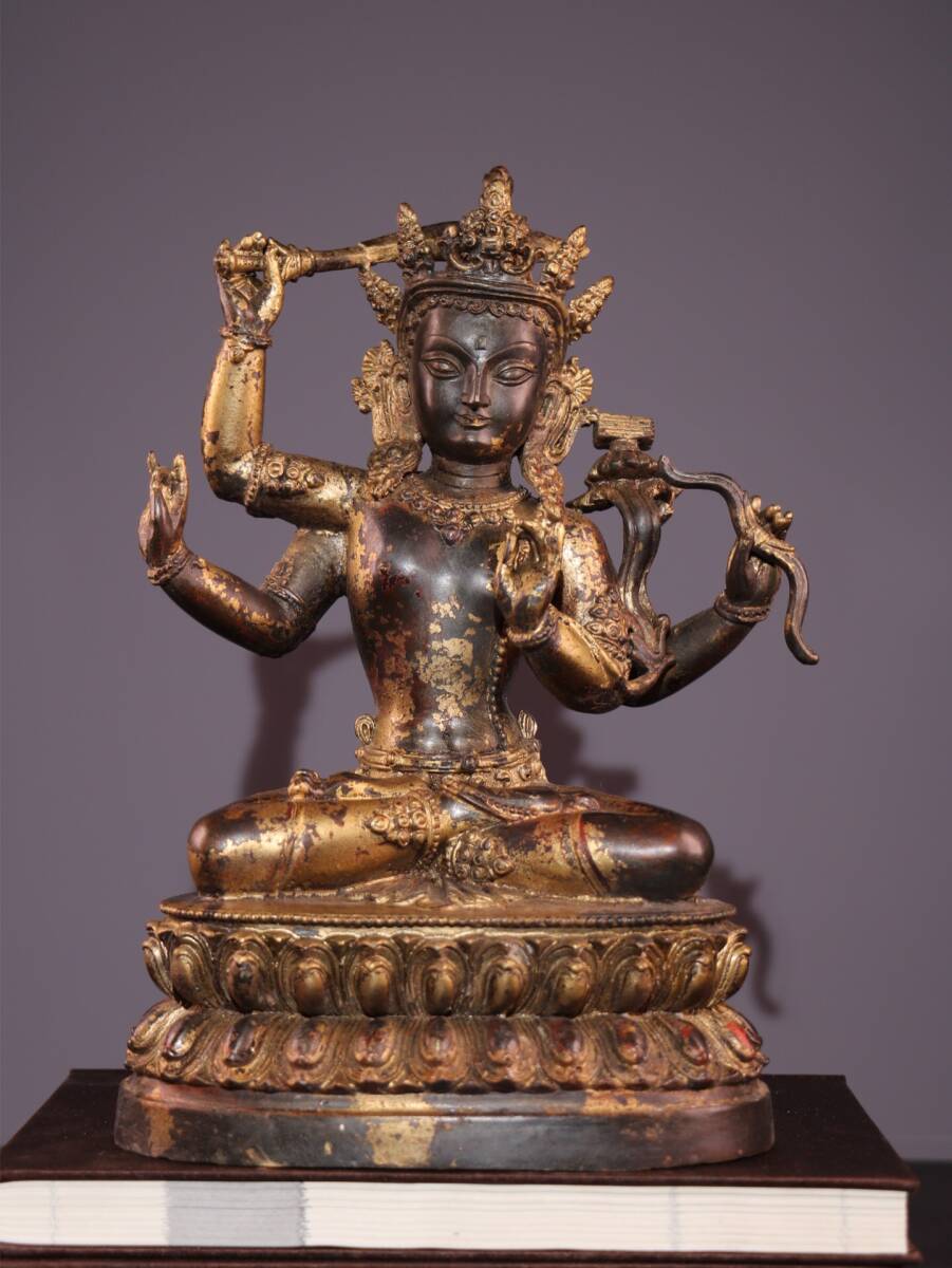 - ▽鴻▽ 銅製 泥金 四臂文殊菩薩像 置物 古賞物 中国古玩 中国古美術