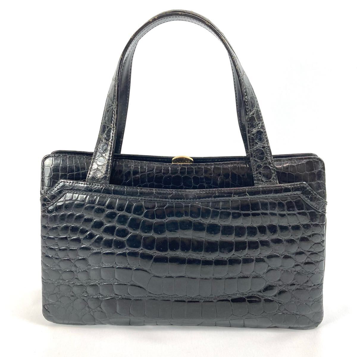 - エキゾチックレザー クロコダイル ワニ革 がま口 ハンドバッグ ブラック 黒
