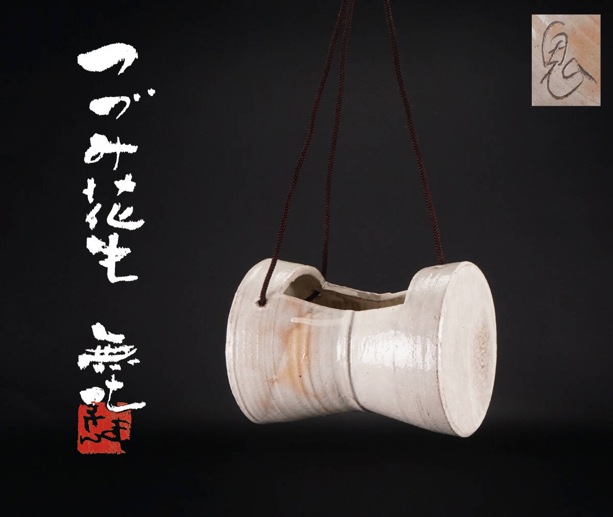- 【asiya152】鬼工房『金子無吐』鼓形 花生 吊り花器 在銘 共箱◆釣花生 華道 生け花 茶道具 コレクター 蔵出し 古美術 即決 送料無料