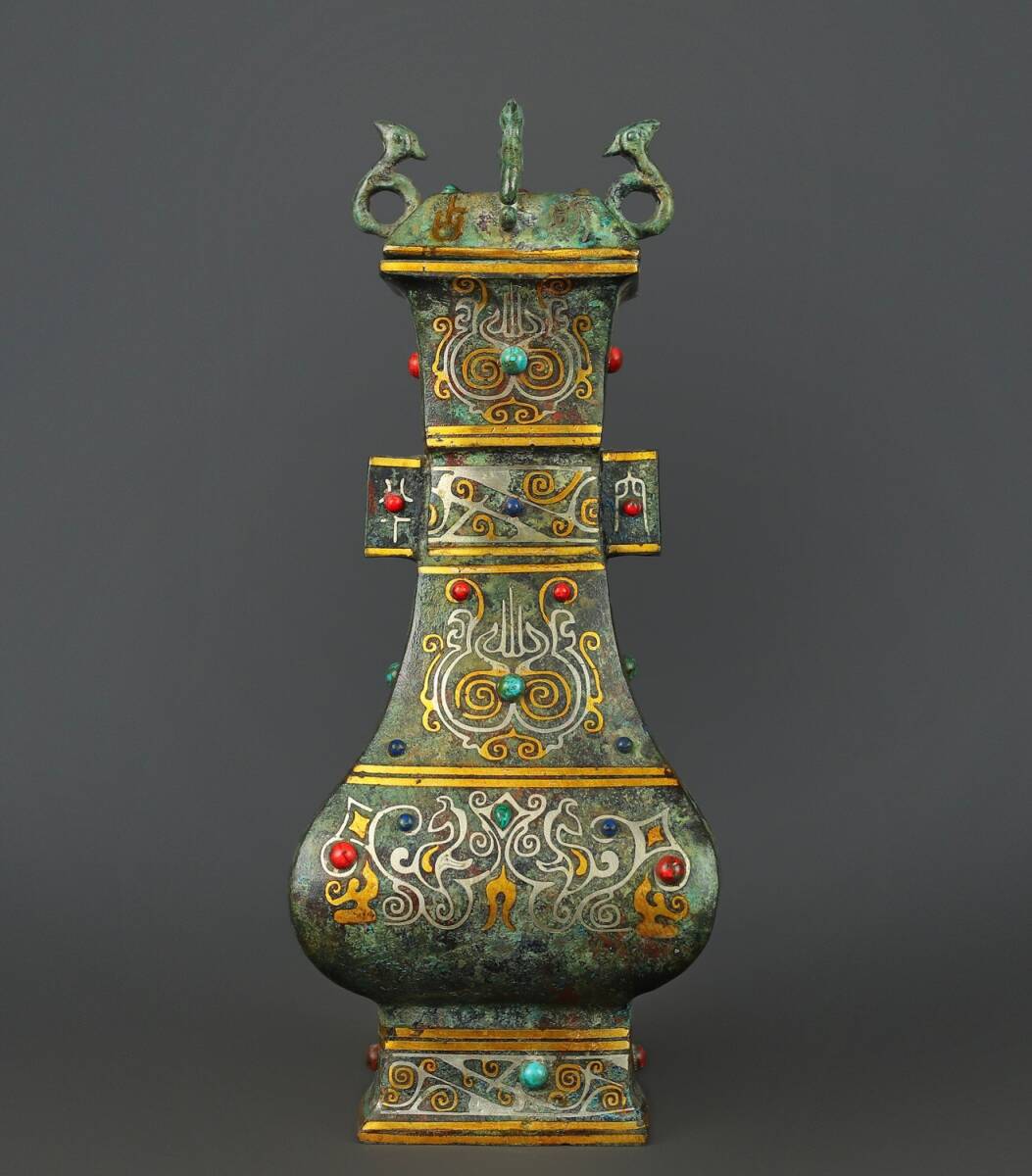 - 【超珍館蔵】漢 青銅製 松石嵌 錯金銀 雙耳方瓶 青銅器 置物 古賞物 古美術品 稀少珍蔵品