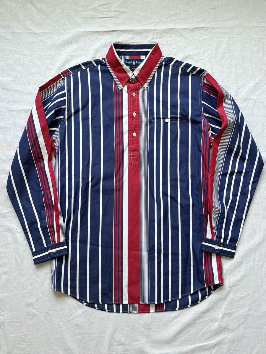 - 希少 Ralph Lauren 長袖シャツ SLATER マルチストライプ プルオーバー トリコロールカラー Mサイズ ボタンダウンシャツ 赤 青 白 USA 米国