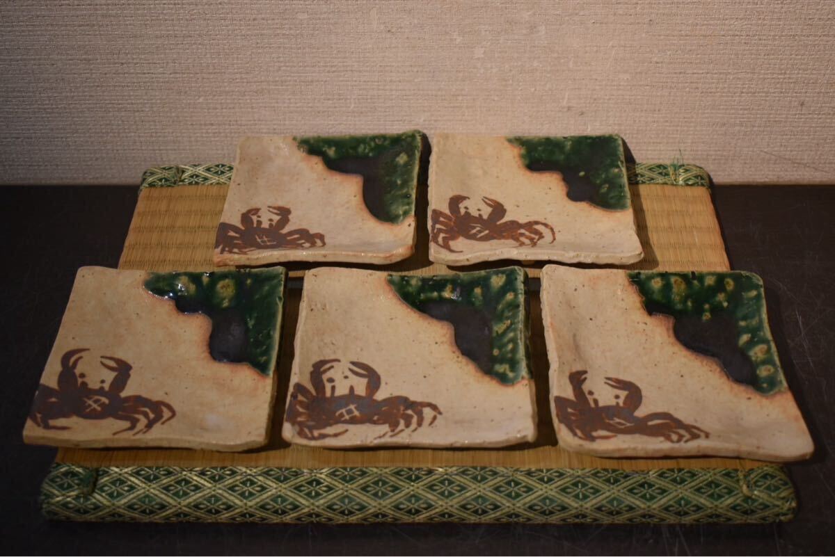 - 織部蟹絵四方皿5件 黒田陶々庵 共箱裏書 本物返品OK 250411−13