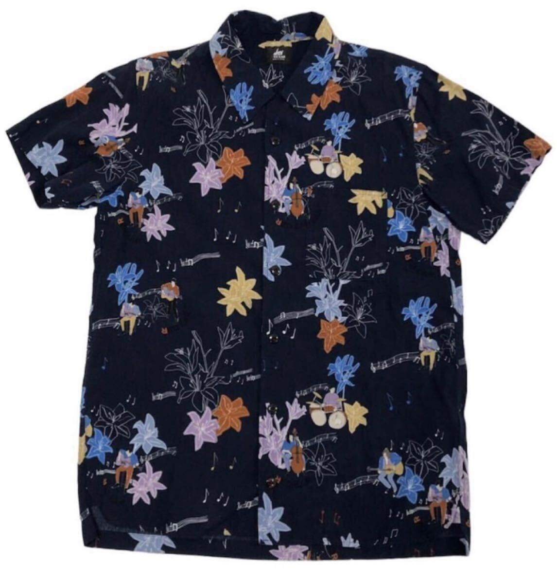 > 送料無料 ■ RED EAR レッドイヤー ポールスミス ■ アートワーク ハイビスカス グランジロック 総柄 レーヨン混 半袖 ボタン シャツ M