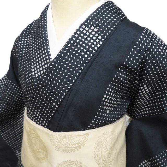 - 紬地 着物 中古 正絹 袷 カジュアル 升目模様 黒色 身丈160cm 裄64.5cm M きもの北條 A1176-6
