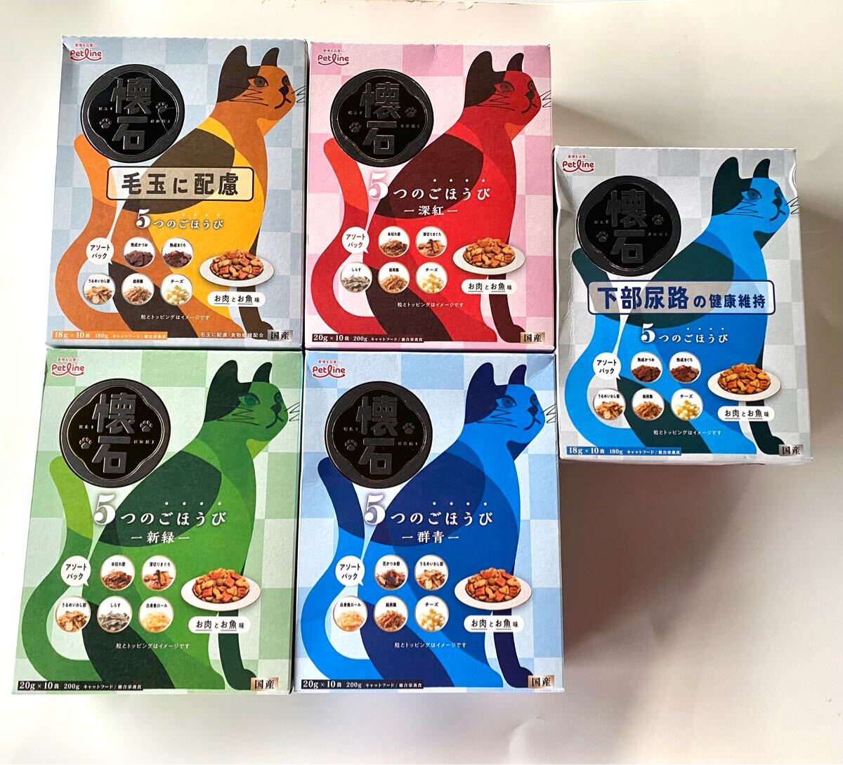 - ペットライン 懐石 5つのごほうび (深紅+群青+新緑+毛玉に配慮+ 下部尿路の健康維持)キャットドライ 国200g×5箱セット アソートパック