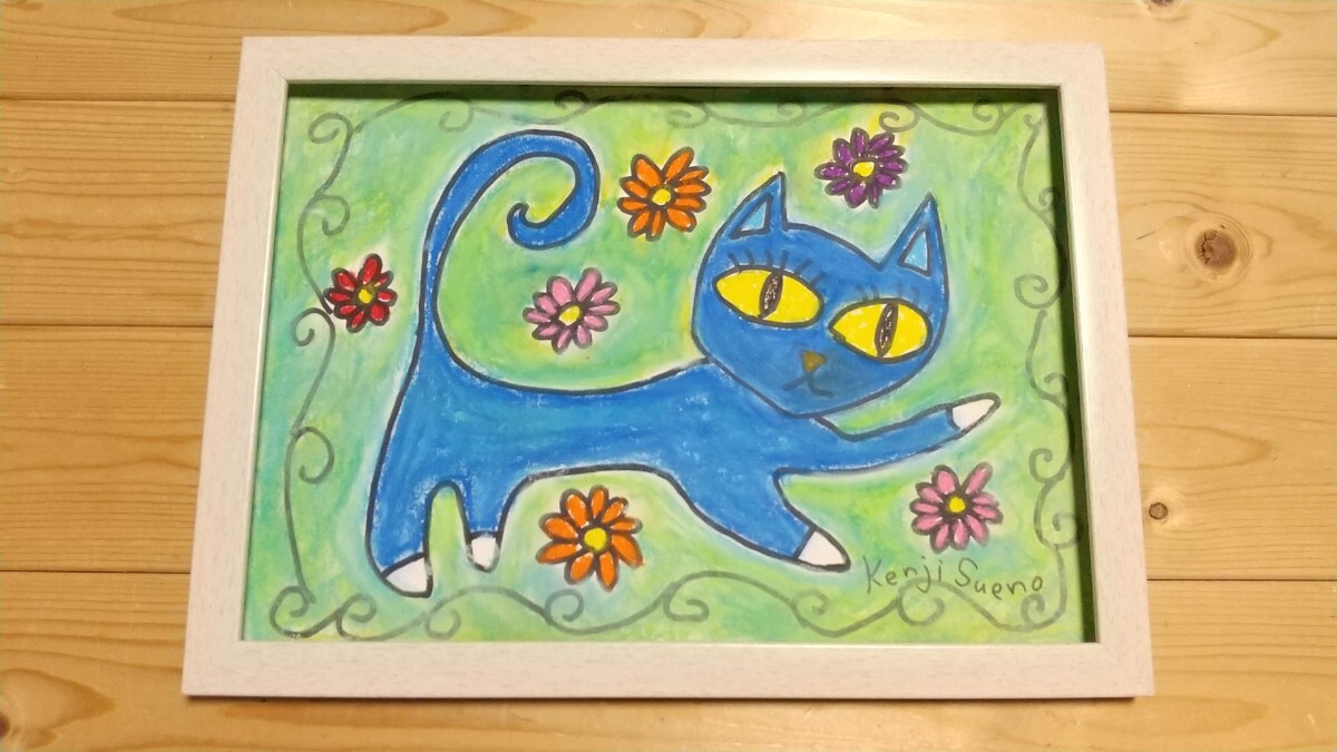 > 【青ねこ】手描き 肉筆 クレヨン画 絵画 A4サイズ 781,Crayon painting, oil pastel painting, original art