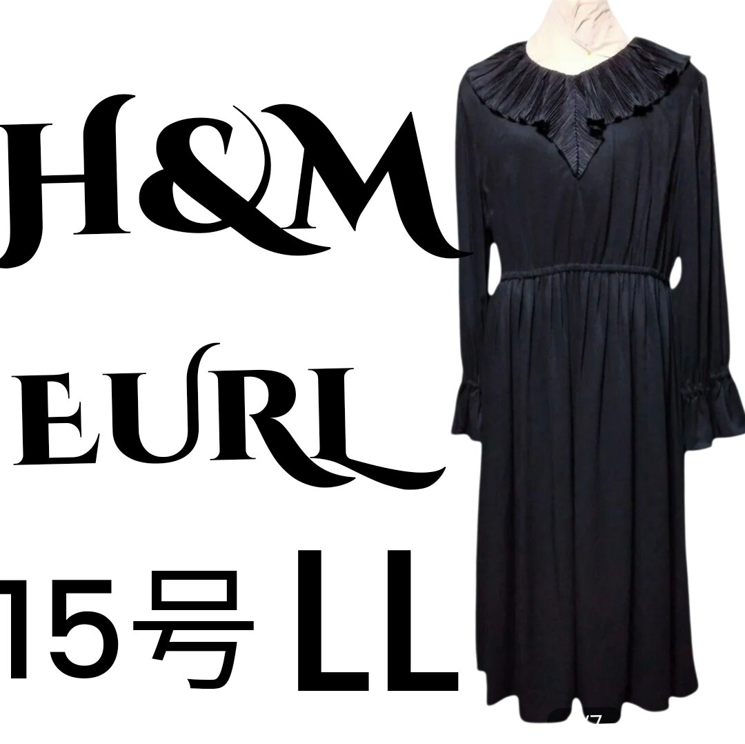 - H&Mプリーツ襟ワンピースEURL15号LL新品タグ付黒大きいサイズ