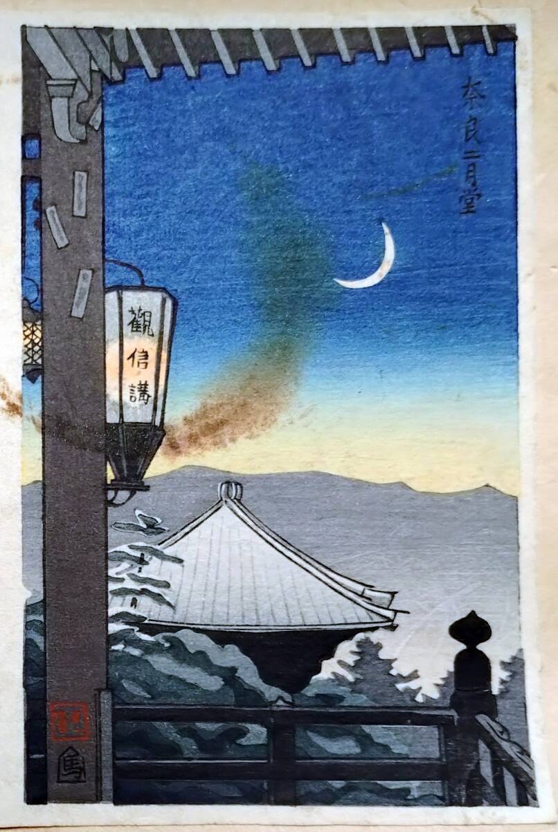 - f25041577〇彩色木版画 ハガキサイズ 奈良 二月堂 錦絵 浮世絵 昭和年代〇和本古書古文書