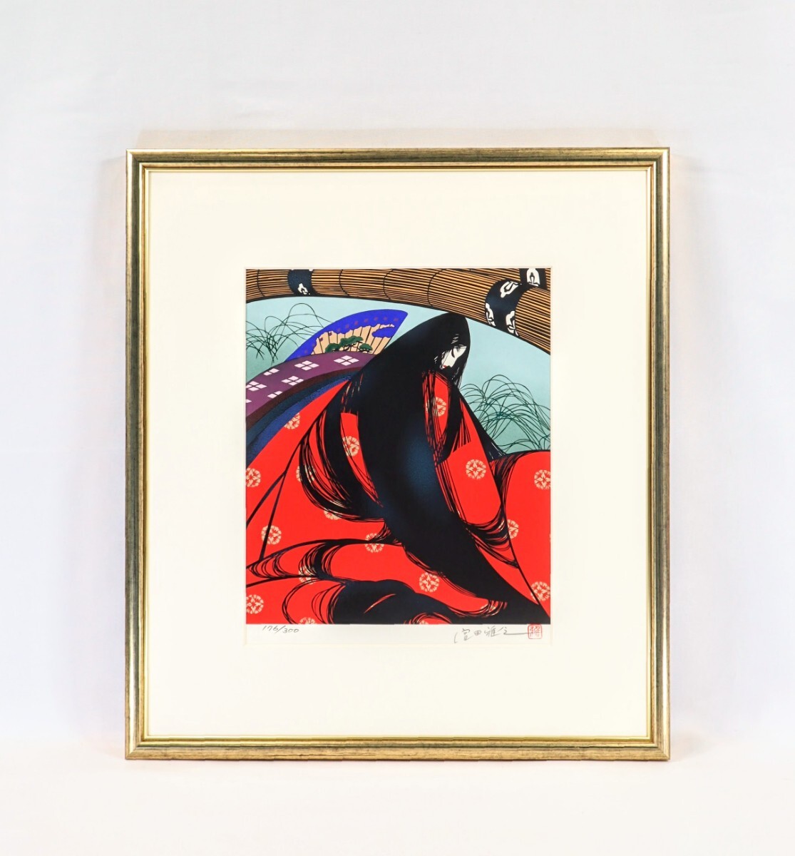 - 真作 宮田雅之 シルクスクリーン「中世黒髪」画寸 23.5cm×27cm 東京都出身 谷崎文学の挿絵画家 剪画作家 平安絵巻の雅やかな世界 10681