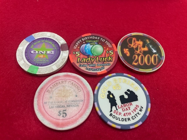 - C-30現状品 チップ 入手困難 本場海外 ラスベガスなど ヴィンテージ カジノチップ $5など ポーカーチップ ゴルフマーカー5枚セット