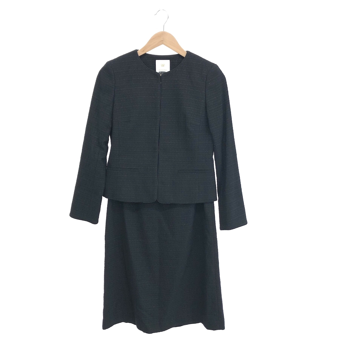 - 良好◆AMACA アマカ ツイードジャケット&スカート セットアップ サイズ:38、40◆ ネイビー レディース フォーマル 上下セット ノーカラ―