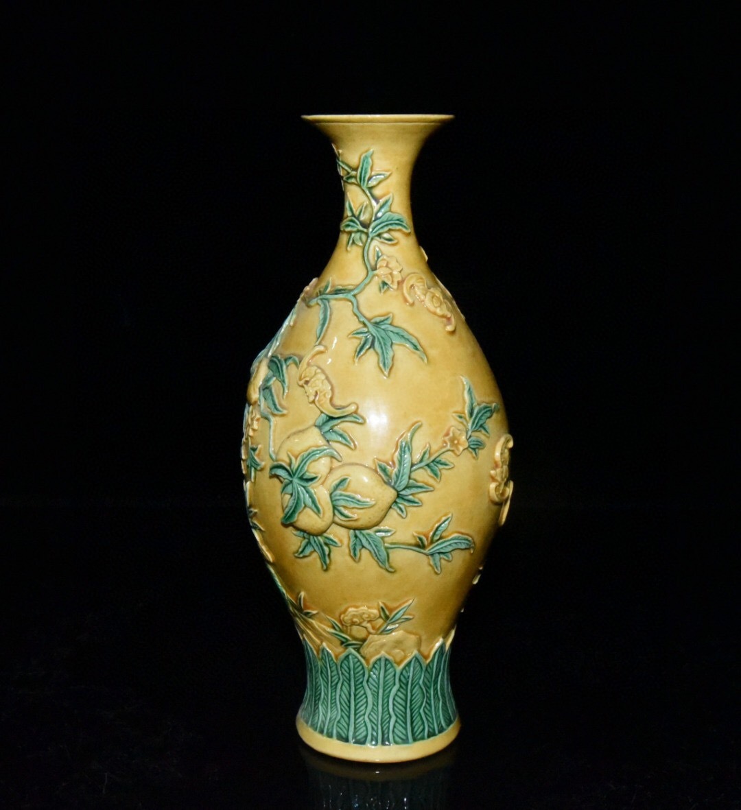 - ▽鴻▽ 清 乾隆年製款 黄釉 九桃紋 花瓶 古陶瓷品 置物 古賞物 中国古玩 中国古美術