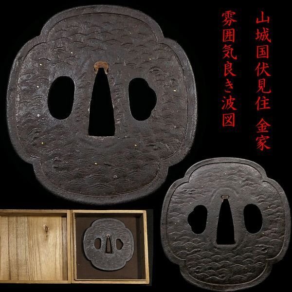 > 【 恵 #1624 】 「山城国伏見住 金家」在銘 雰囲気良き波図 鉄地 木瓜形鍔 検:鍔/縁頭/切羽/ハバキ/刀剣/刀装具