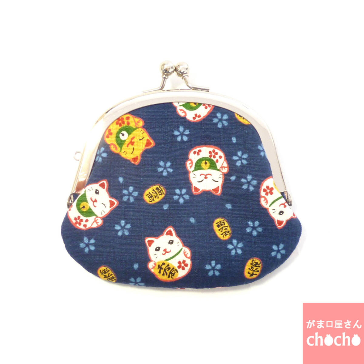 - がま口小銭入れ 招き猫柄 紺 コインケース 財布 ハンドメイド G460 3.3寸