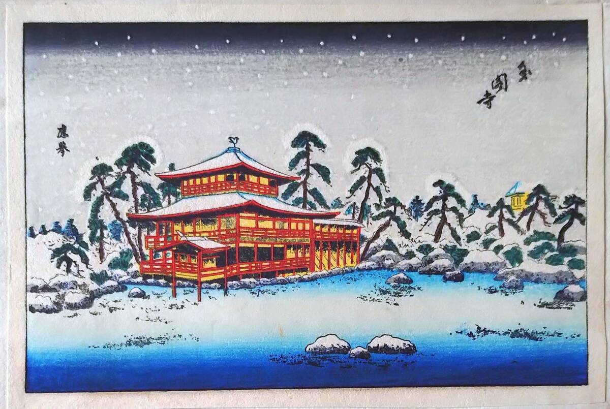 - f25042353〇彩色木版画 ハガキサイズ 応挙 金閣寺 錦絵 浮世絵 昭和年代〇和本古書古文書