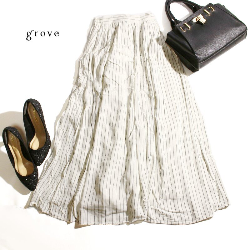 > 美品 グローブ grove 株) ワールド 春 夏 ストライプ 柄 プリント レーヨン 落ち感 ウエストゴム ロングスカート フレアスカート M 白 紺