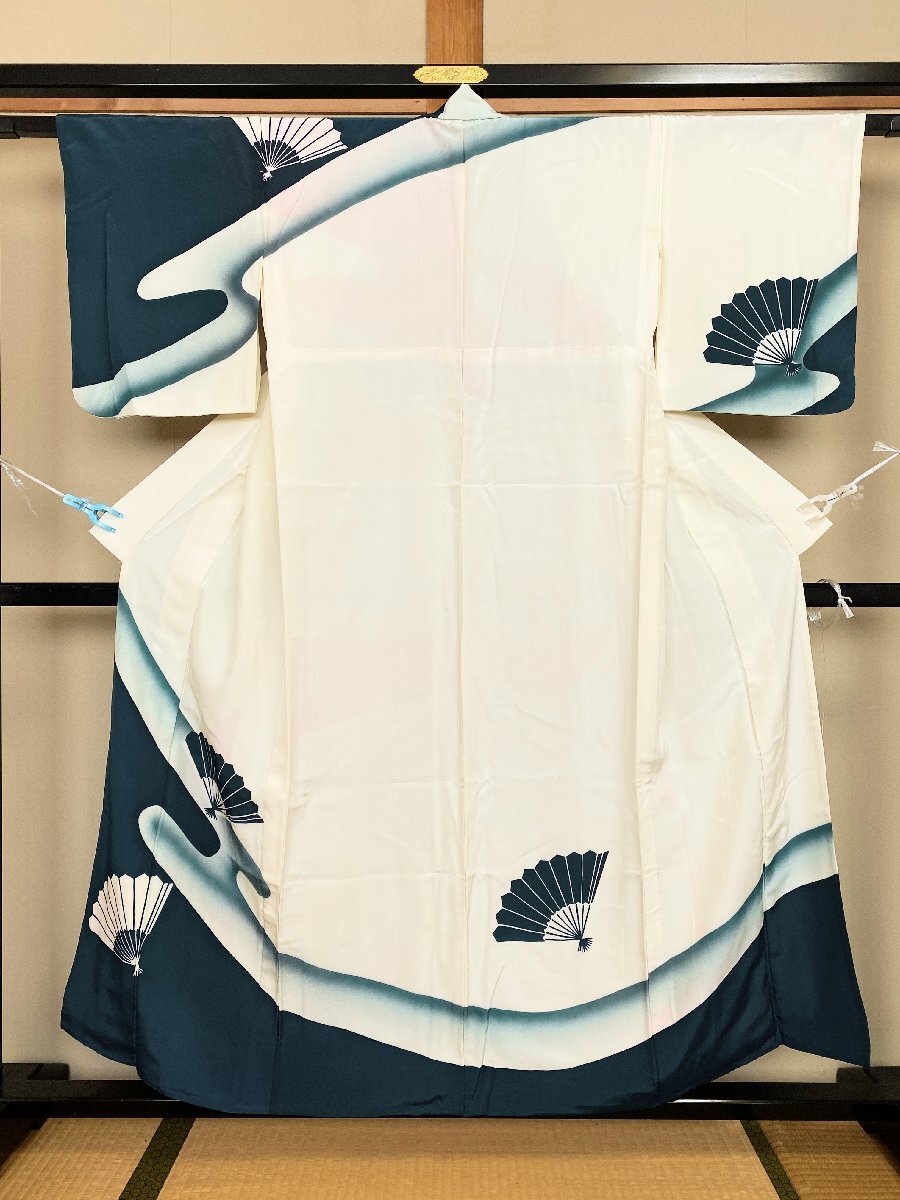 > 187B/アンティーク★女性着物【着用可】訪問着★白地 青緑 深緑 扇絵柄 単衣 モダン レトロ お洒落 リメイク素材 和装