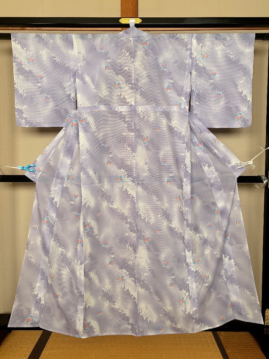 > 166B/アンティーク★女性着物【着用可】小紋★淡い紫色 藤色 蝶々柄 絽 夏物 単衣 モダン レトロ お洒落 リメイク素材 和装