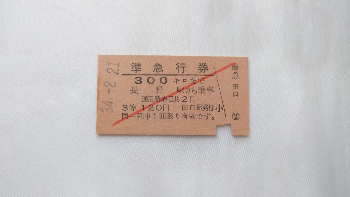 - △国鉄・田口駅発行△長野から300キロまで準急行券△A型硬券昭和34年