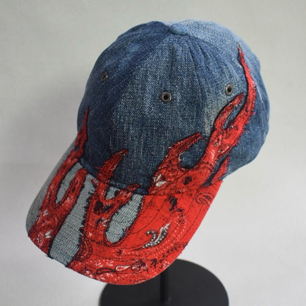 - memento denim boro firepattern cap red 襤褸 デニムベースボールキャップ 一点物 バンダナ 刺し子 パッチワーク 赤 ファイヤーパターン