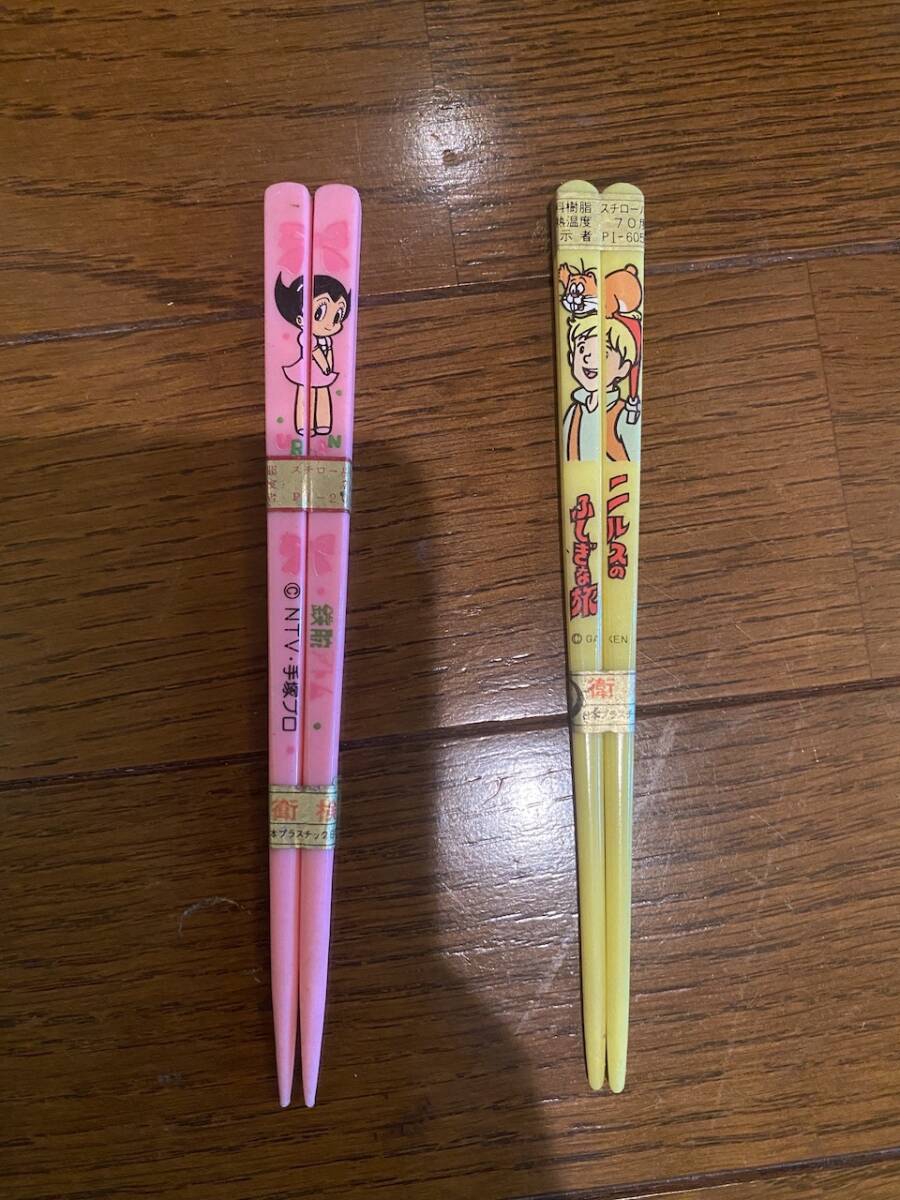 - 当時物 未使用 箸 2個セット 『鉄腕アトム』『ニルスのふしぎな旅』 汚れあり KK4980