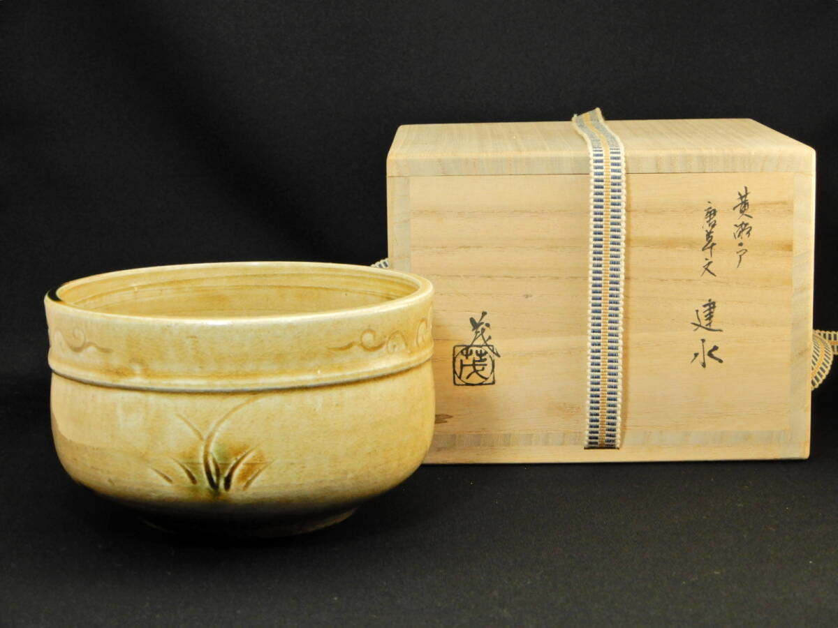 - 山口茂作 黄瀬戸 唐草文 建水 供箱