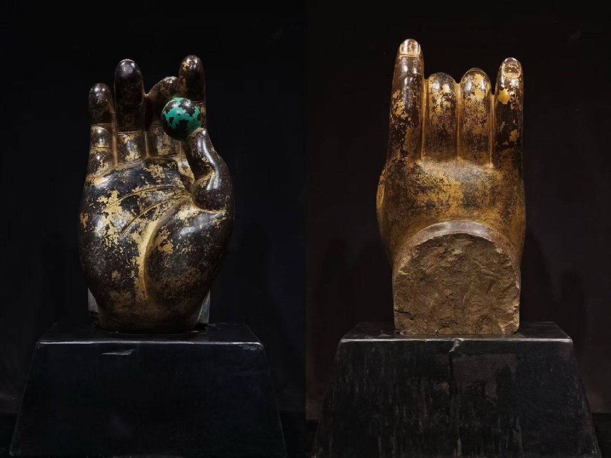 - ■観心・時代旧蔵■R302唐時代 青石彩絵塗金仏手 青石細密彫★仏像★細密細工★廃寺旧蔵★廃寺買出品 高さ57cm横幅30cm奥行き21cm