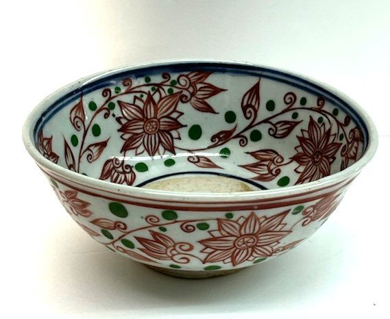 - ★ 100089 紅安南 花紋 茶碗 大 幅16x奥行き15.2x高さ6.5cm 東南アジア 未使用 レプリカ 662 ★