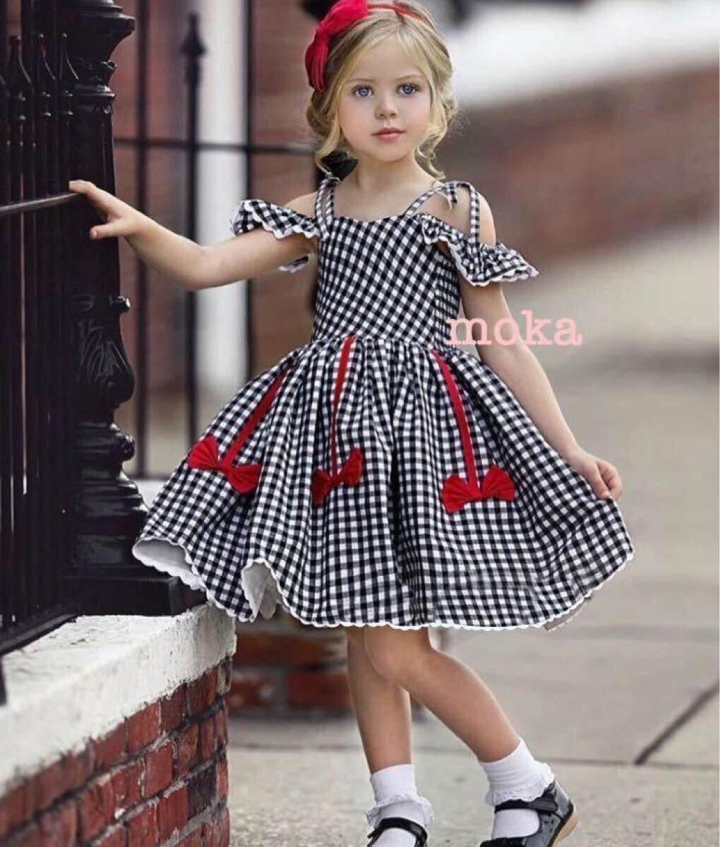 - 新品 90 オフショルダー ワンピース 肩出し リボン ギンガムチェック レース フリル サマードレス スカート ベビー メゾピアノお好きな方