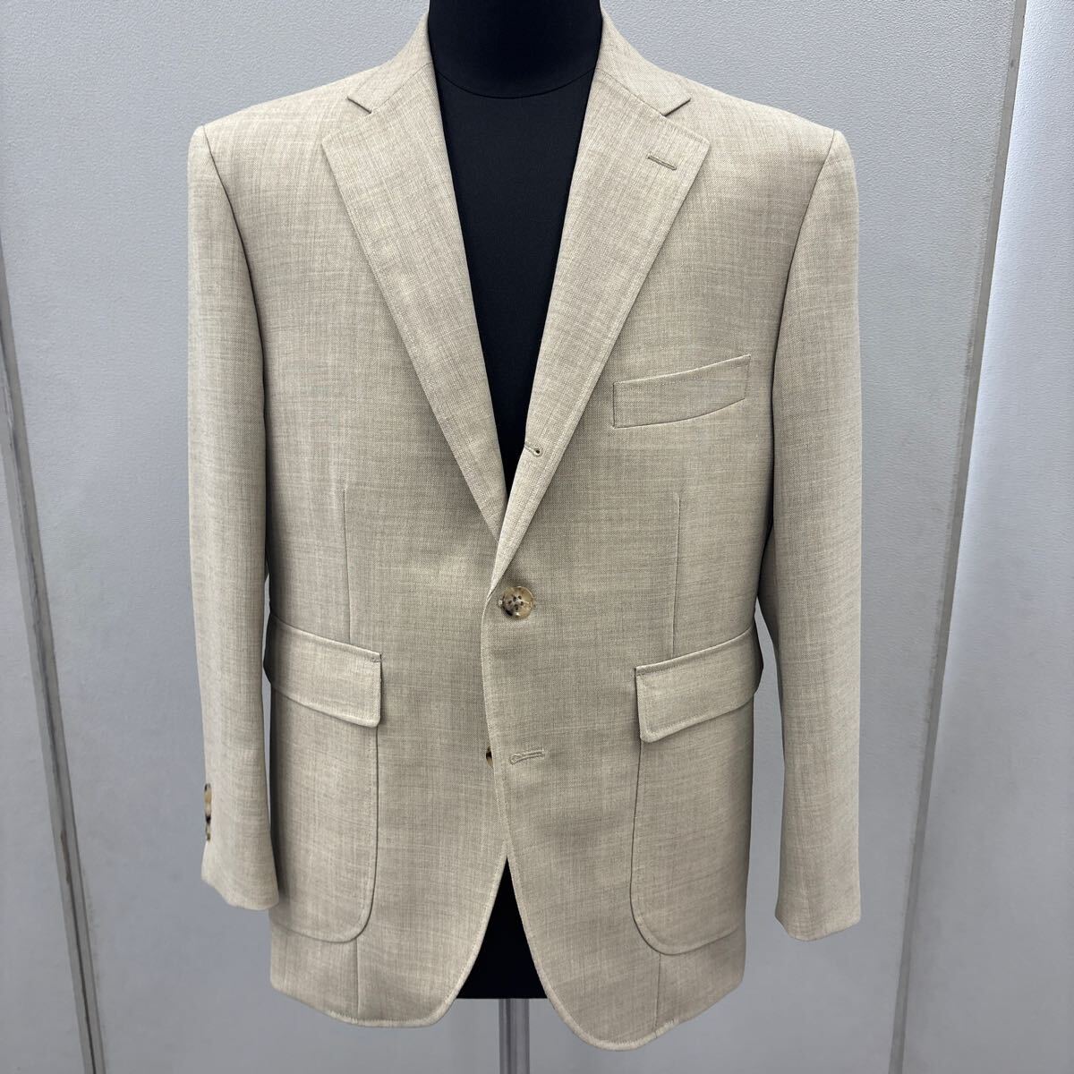 - ほぼ未使用 英国エンパイアミルズ社製生地フレスコ風ベージュ スーツ 背抜 サイズ54またはBB4相当
