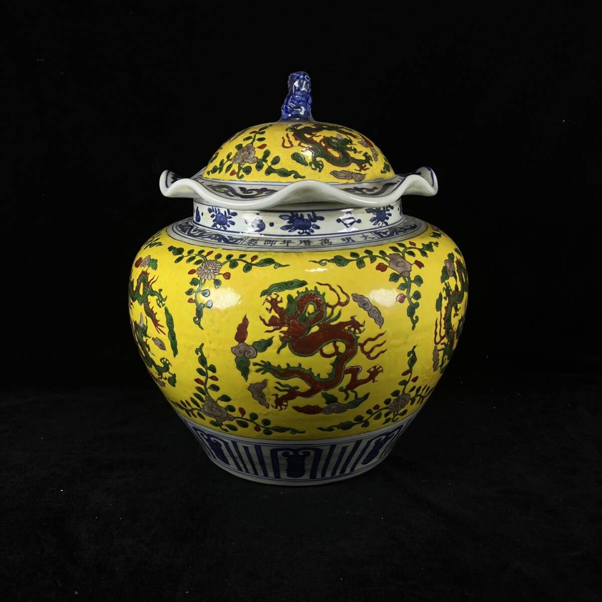 > 多宝閣 ■ 201334 中国磁器 中国骨董【明万利五彩プラス青花竜紋ハスの葉蓋缶】工芸品 施釉陶 陶芸 置物 收藏品 孤品
