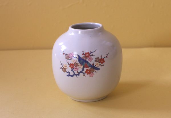 - 陶磁器の花器 フラワーベース 花瓶 壺 つぼ インテリア オブジェ 梅とうぐいす サイズ:外径11×H12㎝/25N4.17-110