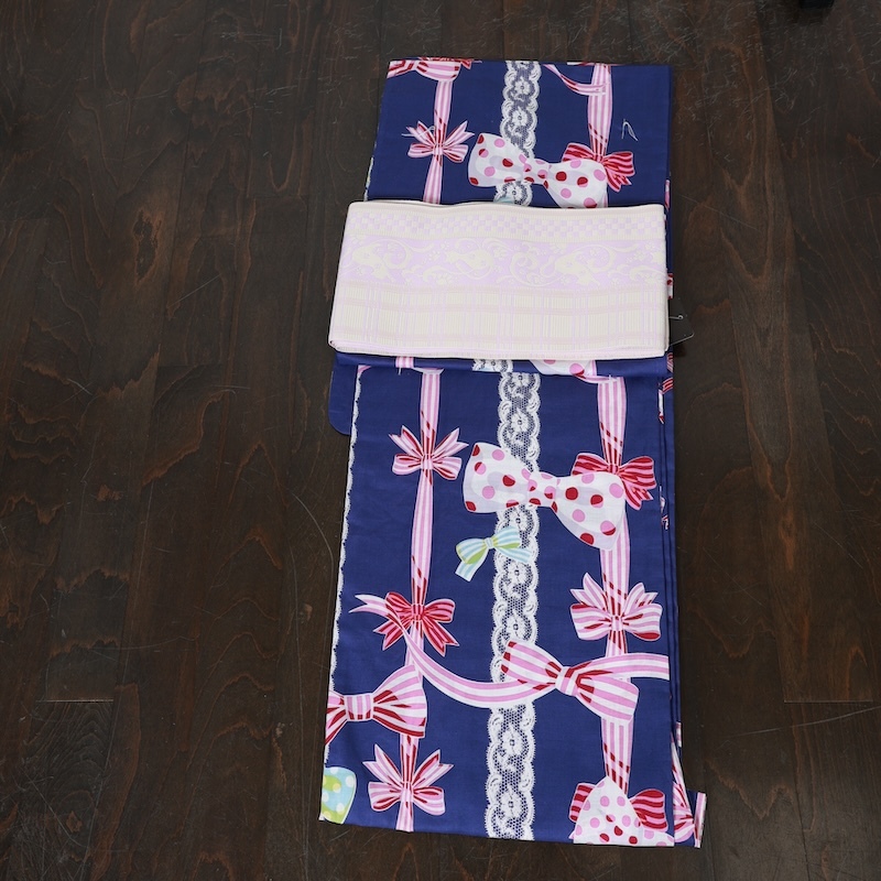 - 浴衣2点セット 新品 藍 ピンク ブルー 白 赤 リボン / O24