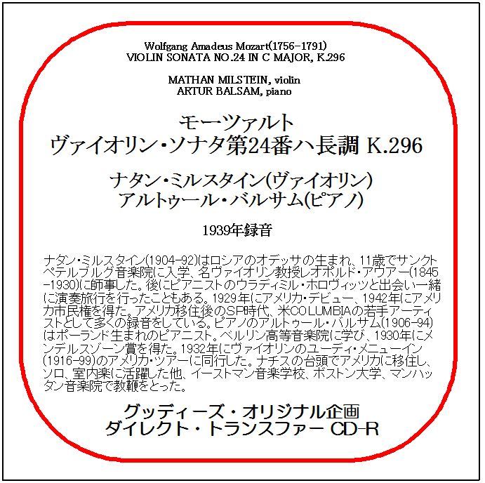 - モーツァルト:ヴァイオリン・ソナタ第24番/ナタン・ミルスタイン/送料無料/ダイレクト・トランスファー CD-R