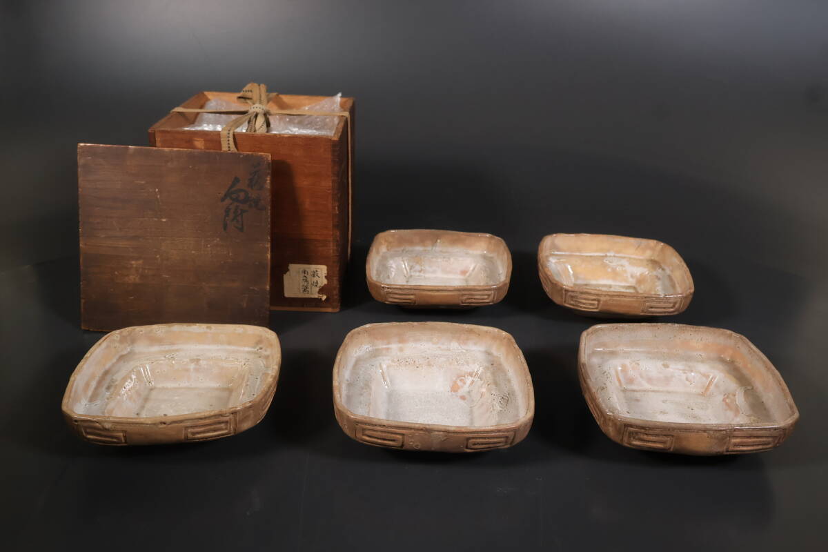 - 【和】(A2551) 時代古作 江戸 古萩四方向付 五客 時代伝世箱有 茶道具